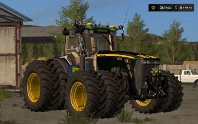 Трактор с интерактивным управлением John Deere 8000 для Farming Simulator 17, открываются двери и окна, мощность до 370 лошадиных сил, максимальная скорость 55 км\час, дополнительно балансировка и двойные колеса, выбор двигателя.